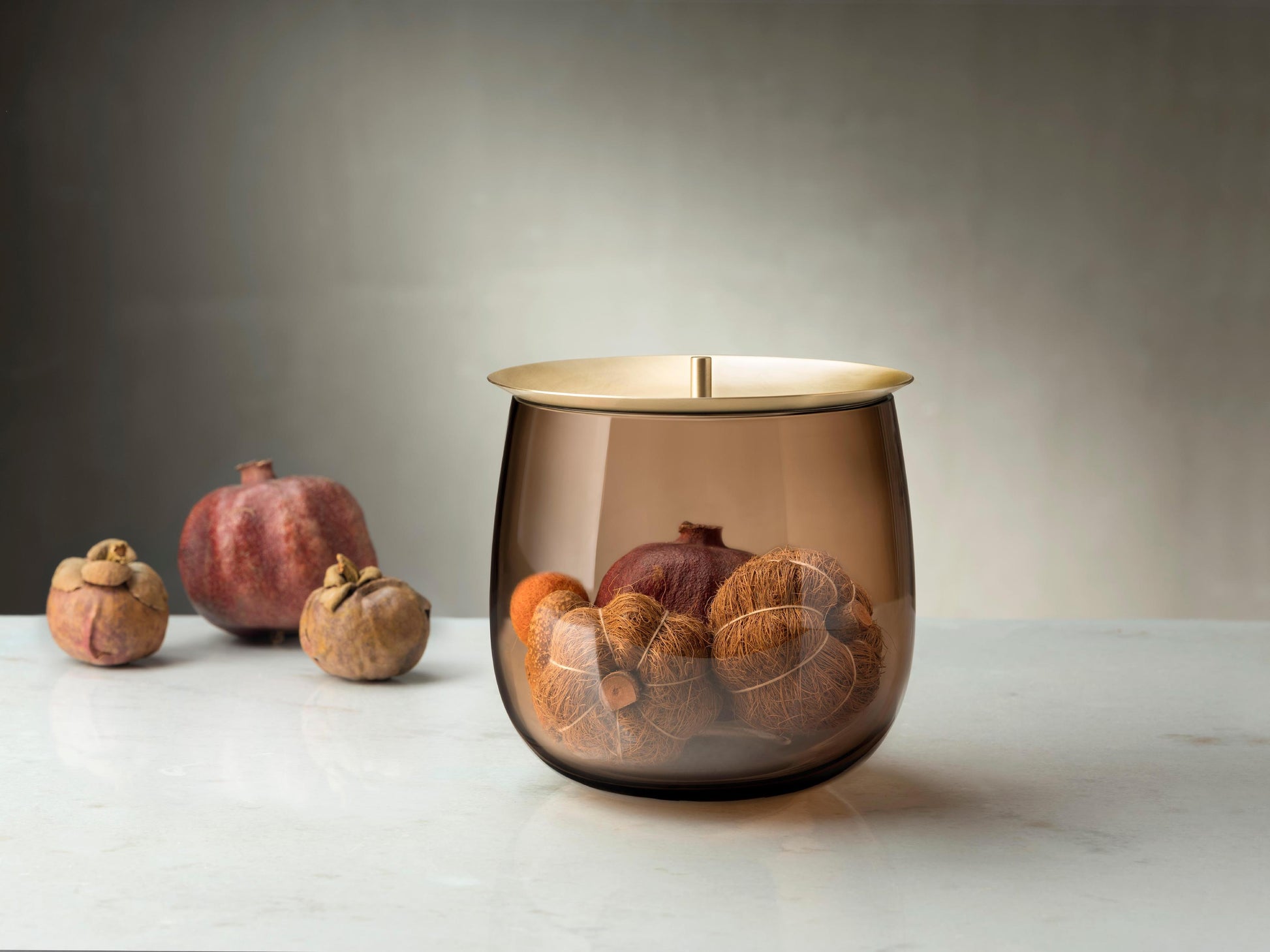 Die Serie Beret von NUDE Glass umfasst Gefäße mit Deckel in verschiedenen Formen und Größen. Sie eignen sich hervorragend für die Aufbewahrung von Schmuck und kleinen Schätzen. Dieses schlichte, praktische und elegante große Aufbewahrungsgefäß besteht aus einem Behälter aus Kristallglas und einem seidig wirkenden Messingdeckel - ein wiederkehrendes Thema der Kollektion und eine Anspielung auf den berühmten Hut aus Frankreich - die Baskenmütze.